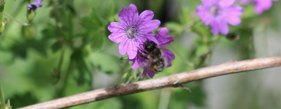 Die Wiesenhummel findet Nahrung am Felsen-Storchschnabel.