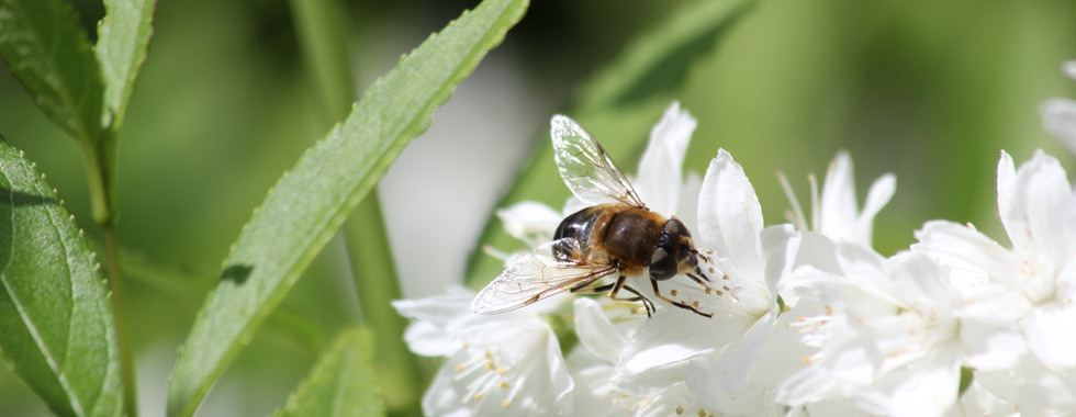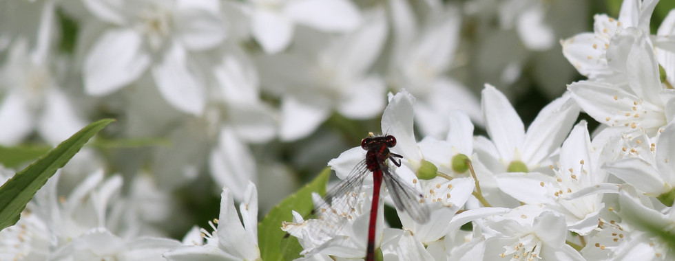Viele Insekten wie z.B. die Frühe Adonislibelle, die Wiesenhummel, die Honigbiene, die Baumhummel, der Rosenkäfer und die Mistbiene tummeln sich am Maiblumenstrauch.